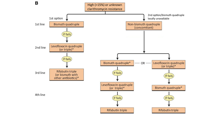 Източник: Malfertheiner P, Megraud F, Rokkas T; European Helicobacter and Microbiota Study group. Management of Helicobacter pylori infection: the Maastricht VI/Florence consensus report. Gut. 2022 Aug 8:gutjnl-2022-327745.