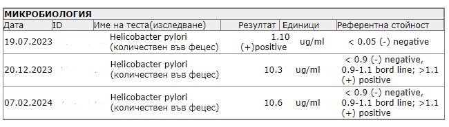 Имаше на лечението бисмут Улкамеде бисмут.Знам най новия метод за лечение на бактирията е 4-комбинация бисмут,ипп,метранидазол,тетрациклин за 14 дни споделено от др.Стефан Митев но като кажа на лекара на мен ми казва защо не съм учил медицина,явно не искат да се бърка работата им.Лекара казва фекалния тест е точен защото на биопсията където е взета биопсията може да нямало бактерията.По принцип от 5 места трябва да се взема биопсия така прочетох статията на др.Митев.Незнам къде да закарам майка ми?Да ли наистина има ли ХБ?