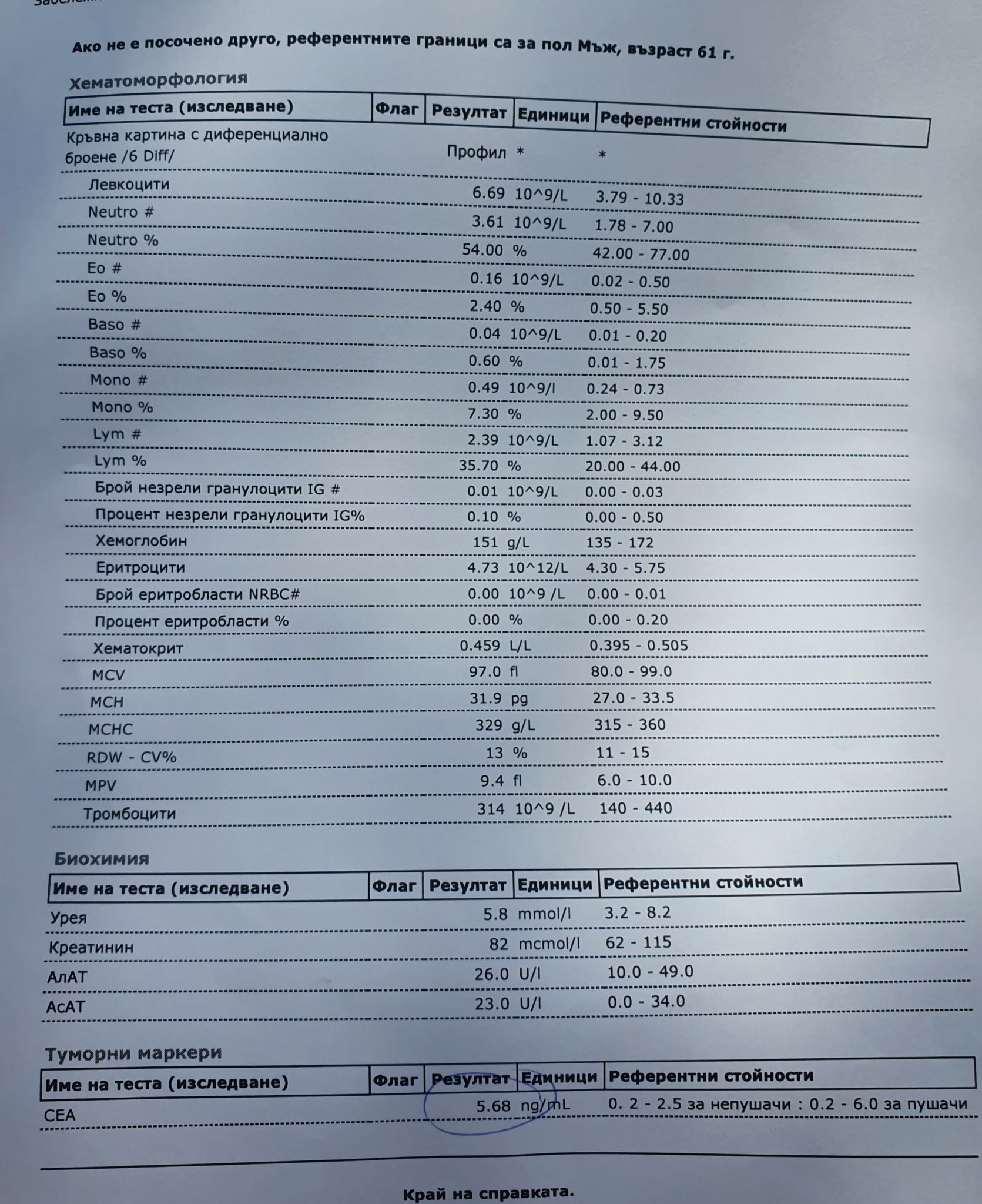 Здравейте,бих искала да получа отново съвет от вас...Юни месец стават 2 години от операцията на баща ми(рак на дебелото черво,61г.).Диспансеризиран е,последния скенер прави ноември ,който беше добре.Преди седмица отидохме до диспансера да пуснем изследвания и според резултатите да преценят кога ще дадат дата за следващ скенер.Казаха,че резултатите са добри само туморния маркер(СЕА) е завишен,но защото бил пушач.И дадоха дата за скенер пак за ноември.СЕА повече от година е около 4.00-4.10,а сега е 5.68(разликата е за 6 месеца),отслабнал е с 4кг пак.Моля ви,кажете вашето мнение,притеснена съм ...да го заведем ли по- рано на скенер другаде?Благодаря!