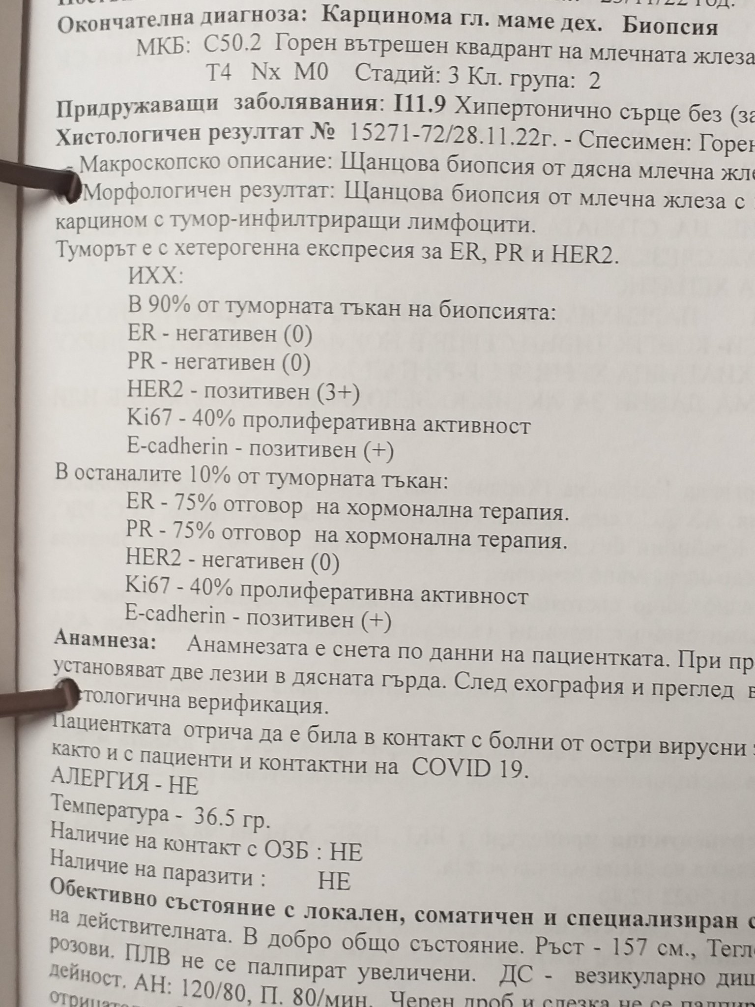 Здравейте! Отново ще помоля за малко помощ и съвети. Да припомня за нашия случай - на майка и беше поставена диагноза рак на гърдата преди 2 месеца някъде. Заради Ковида, който ни повали се забавихме малко с консултациите и лечението. В крайна сметка направихме биопсия при д - р Валентин Иванов в КОЦ Пловдив първа база. Качвам резултатите, ще помоля и за вашите мнения. Накратко ни казаха след комисията, че двете проби са положителни, двете отрицателни. Правихме,и скенер. Назначиха химиотерапия ( точно каква, не знаем ), както и някаква прицелна терапия за която също нищо не ни обясниха. Информирах се сама от Гугъл. Тук искам да вмъкна, че по - отвратително и грубо отношение от почти целия персонал на КОЦ Пловдив, и двете бази, особено база 2, не съм срещала. Третират всички пациенти като животни. Крясъци, нервни изблици, арогантно държане. Не търпят да им се задават въпроси, не отговарят на тях, не обясняват абсолютно нищо. Имената на лекарите даже не знам. Знам номера на кабинети. Честно ви казвам, на косъм бях да набия някой. Чета ви и ви се възхищавам как си знаете лекарствата, вливките, лекуващите лекари и всичко. Аз съм в една мъгла и ми се реве вече от безсилие.