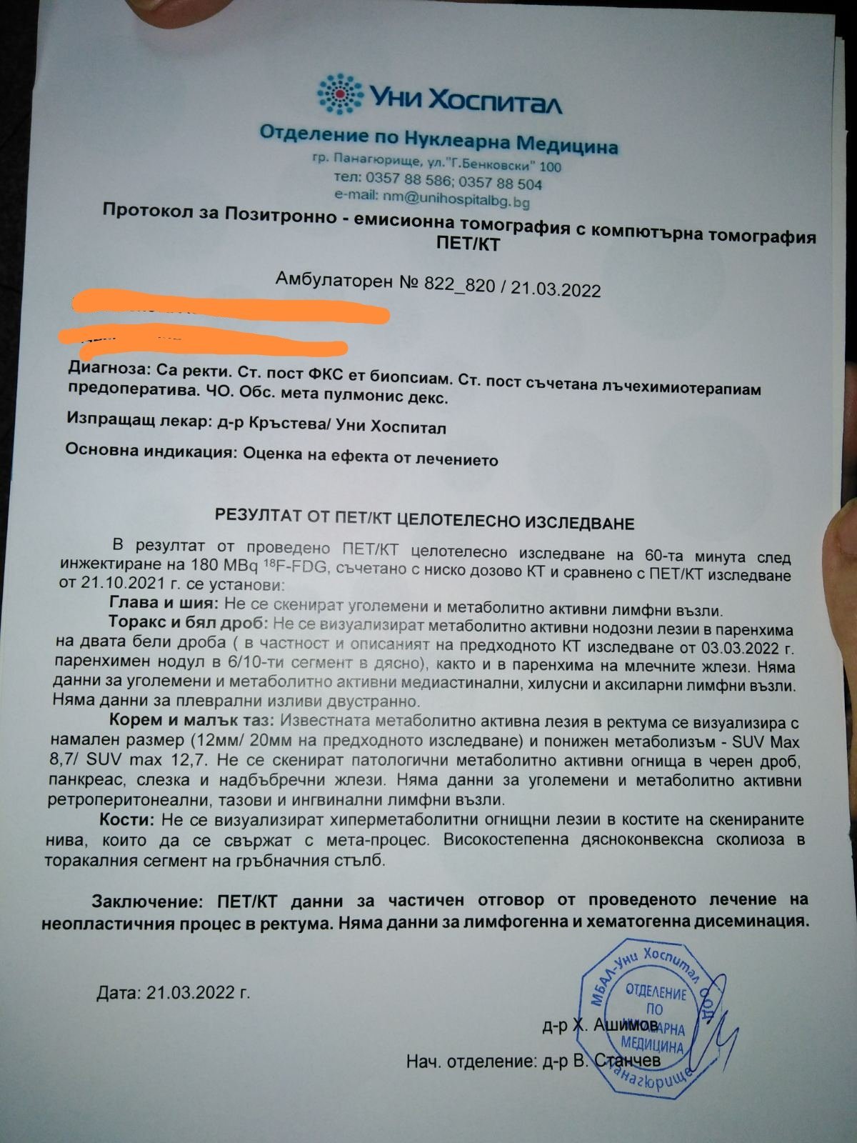 Ще се свържа с професор Тимчева за мнение, сега прикачвам документите, които имаме. Много четох, уж, и за kras мутацията в 12v и 12c, и за това, че не се влияят от предлаганата химия, ако ракът е метастазирал.. Дано да греша.. Странно ми е как може да я карат тя да избира дали да има химио преди операцията или не, без да и дадат насоки и обяснения. Питала е  кое е по-добре, какво ще я посъветват, лекарката е казала, че нищо не може да каже, тя да си решава. Дано поне професорката ни даде насоки, другата седмица има записан час при хирург