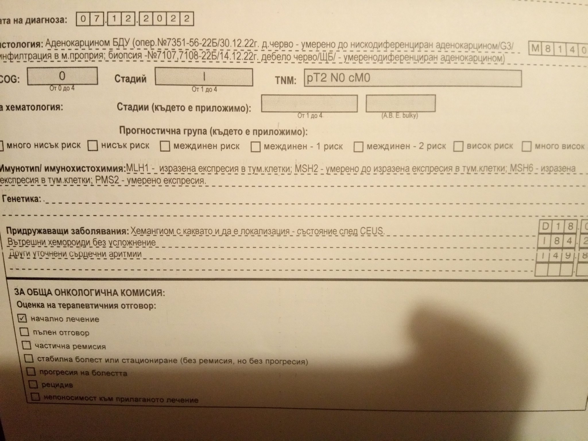 Отидете при доц. Консулова с всички документи и се разберете къде да занесете материал за изследване на dMMR/MSI. Така или иначе резекционните линии са чисти - в момента надали ще Ви влезе в употреба тази информация, но е важно да я знаете. И, ако не са правени КТ или ПЕТ - няма да е лошо да направите, за да сте сигурни, че няма вторични формации/да се завърши стадирането. Тя ще Ви ориентира.