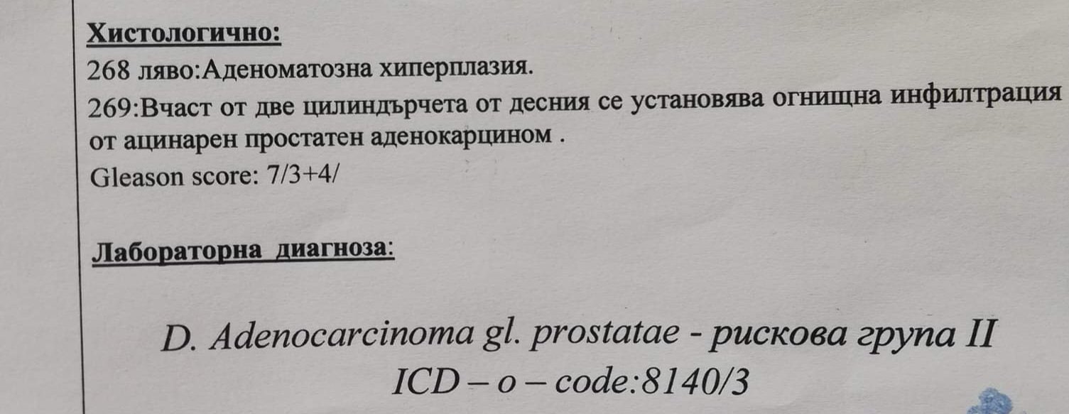 Специално за теб, понеже сега нямам много време, върни се и прочети постовете ми в старите теми, а и в тази мисля. Дори съвсем наскоро си писахме с потребителка по повода. Доста обстойно при това. Минали сме и вървим по този път, като гледам горе-долу еднаква диагноза и еднаква хистология, и при ММ беше само в единия дял на простатата, но я махнаха цялата. Вероятно резултатът е от биопсия?