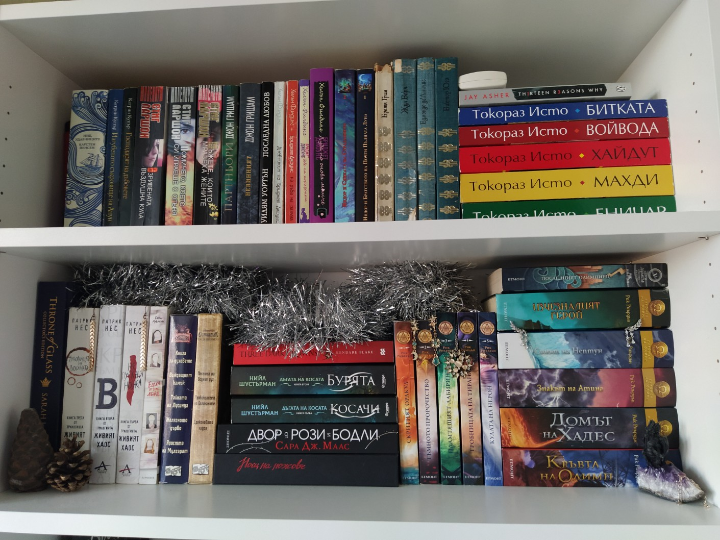 Ева и преди съм писала, че чете, имаме уговорка за отлична оценка да получава по 2 книги, винаги е много ентусиазирана като почне нещо ново. От известно време качва и снимки на книги в Bookstagram. Баща и се опитва да я насочи и към друга литература, но за сега си чете само нейните фентъзи неща. Ето едната библиотека (има и наши книги):