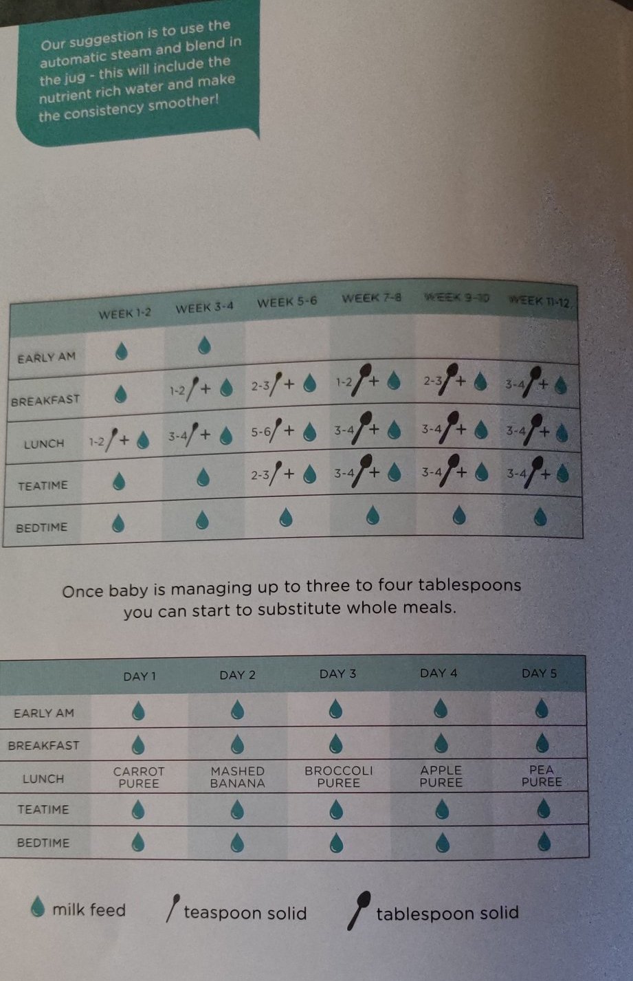 Аз мисля да комбинирам задушени зеленчуци с пюрета след 6м. Купих и една машинка, която задушава на пара и/или пасира. Към нея има и схеми на захранване и рецепти. Споделям схемата за 6м.