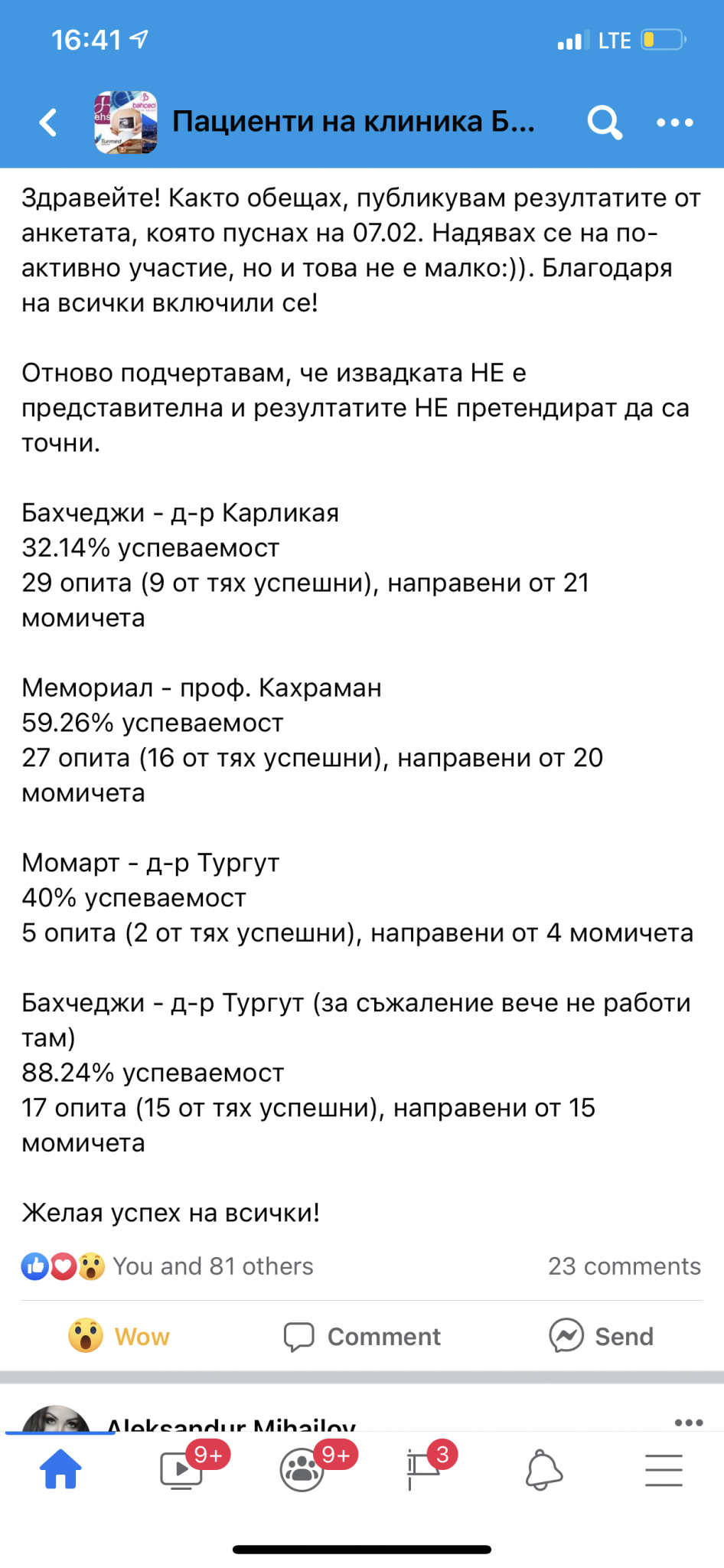 Не разбрах как всичко стигна до тук. Аз просто отговорих на tatabobi86 и обясних, че и аз бях отишла в Бахчеджи с изследвания от Бг и при стимулацията не ми бяха пускани изследвания. Просто и напълно човешки обясних как при мен се случиха нещата. Но както винаги някои пациентки не пропускат възможност да нападнат др.Карликая( не се случва за пръв път), явно отново издебнаха момента да изплюят злобата си. VDimitrova111, аз също знам, че резултатите могат да се научат от координаторките, но под резултати имах впредвид положителни резултати, с които да се похвалят от други лекари в други клиники . Например, аз съм пациентка на др.Карликая и съм бременна, за което винаги ще съм му благодарна. Всеки има право на мнение, затова аз ще продължавам да защитавам др.Карликая, а на който не му отърва- лекари и клиники бол. Успех на всички!