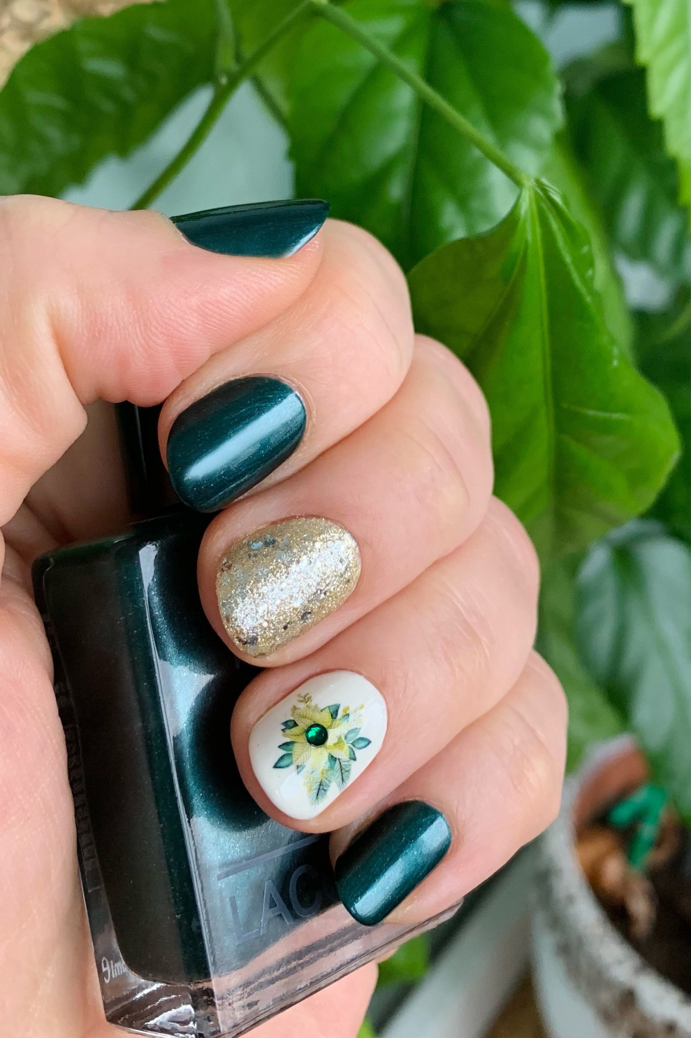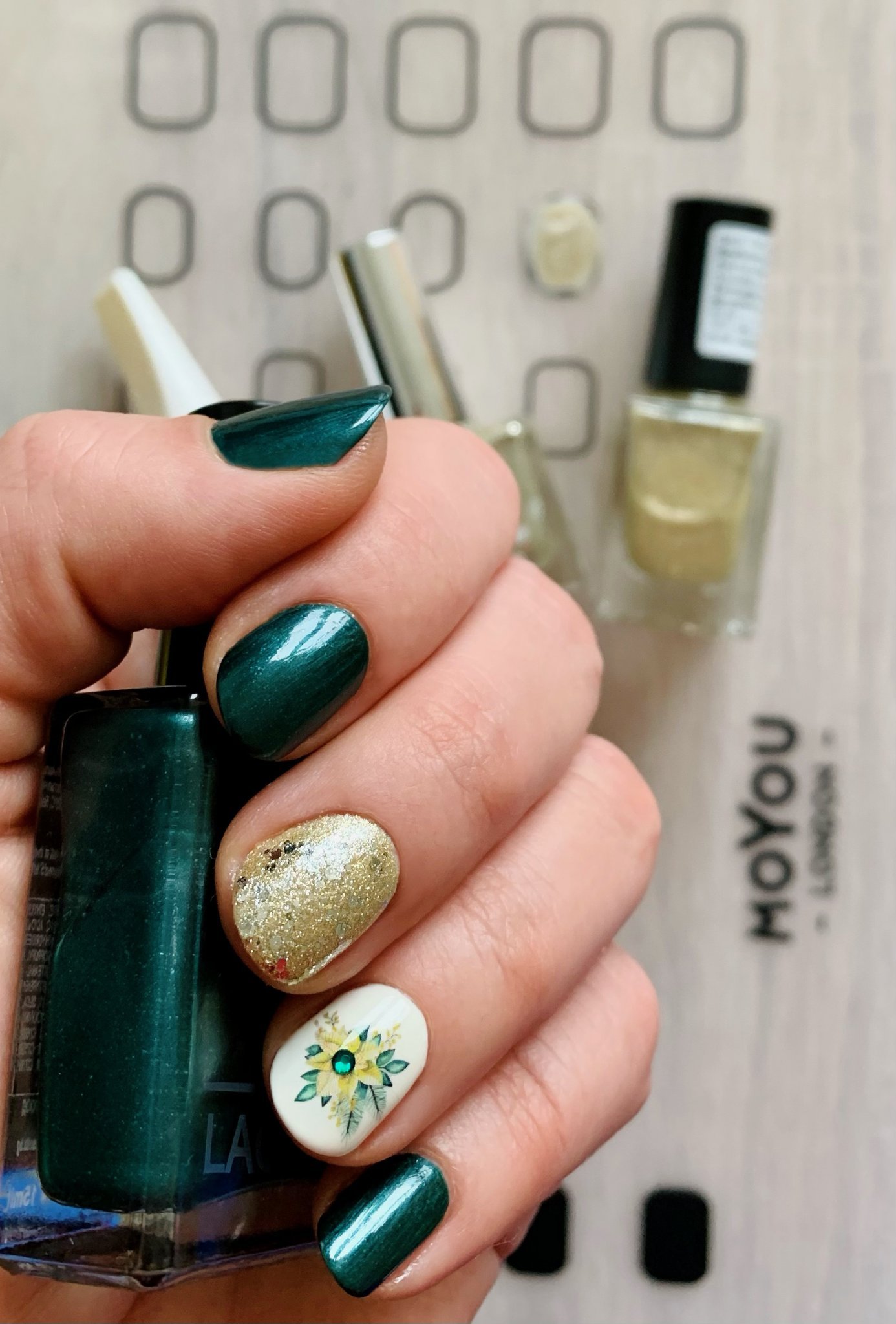 ), се предадох и купих лилавия заздравител на Перфект и най-накрая се лакирах с една разкошна тъмнозелена Детелина на SNB. Финият златист брокат на Trend it up ми се видя недостатъчно лъскав и отгоре сложих едър на GR. Колкото пораснали, толкова, не се издържа вече