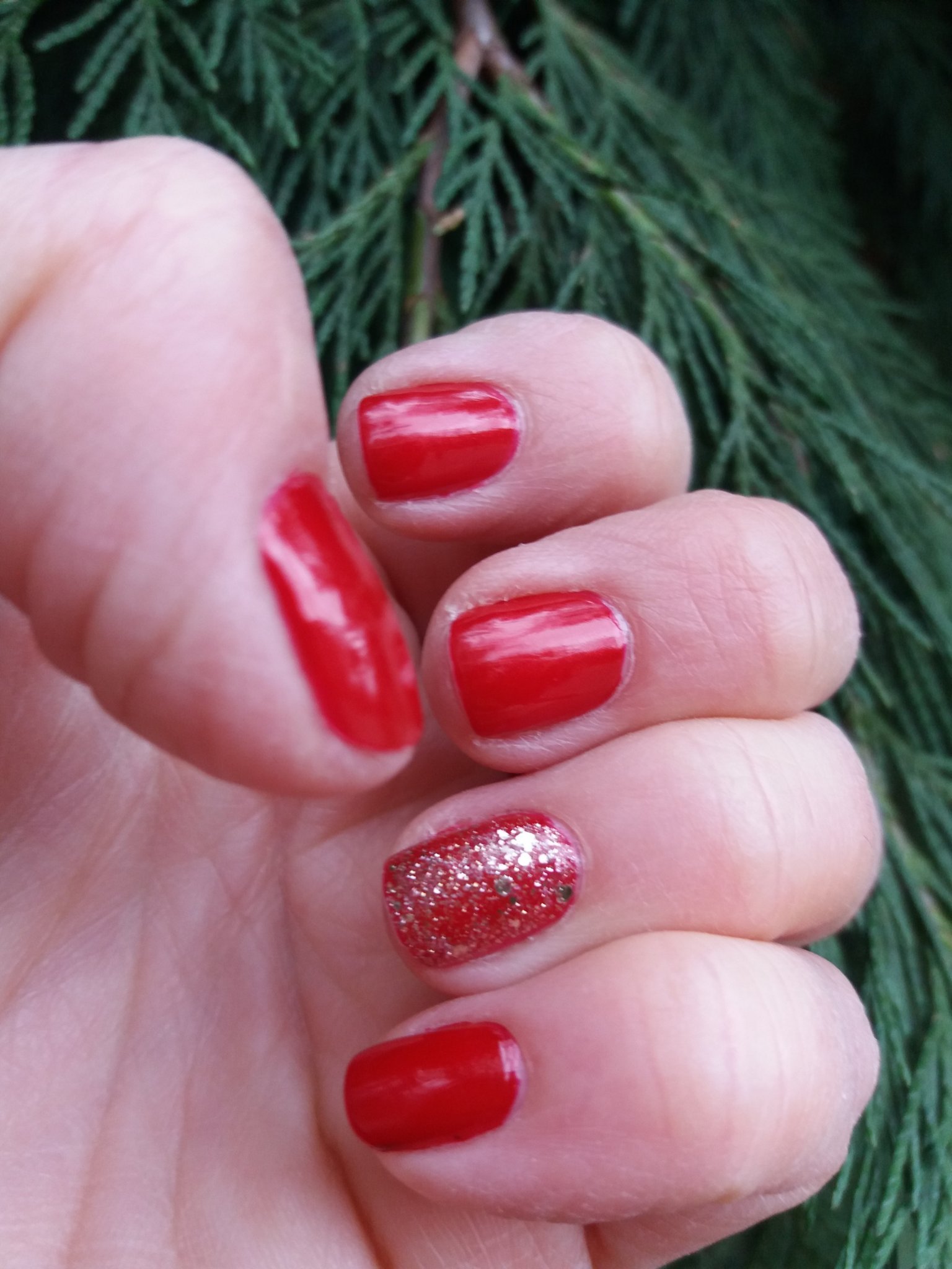 И аз продължавам в червената гама с Masura Winter Love Song. Не съм много очарована от формулата, доста течен е и ми беше трудно лакирането. На късите ми нокти нямаше как да го запечатам хубаво и вече имам няколко оголени връхчета за един ден носене.