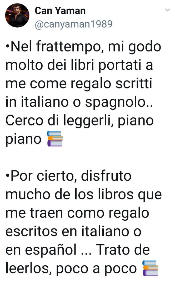 И също #CanYaman написа публикация на италиански и испански ... "но засега много ми харесаха представените ми книги, на италиански и испански, опитвам се да ги прочета бавно"