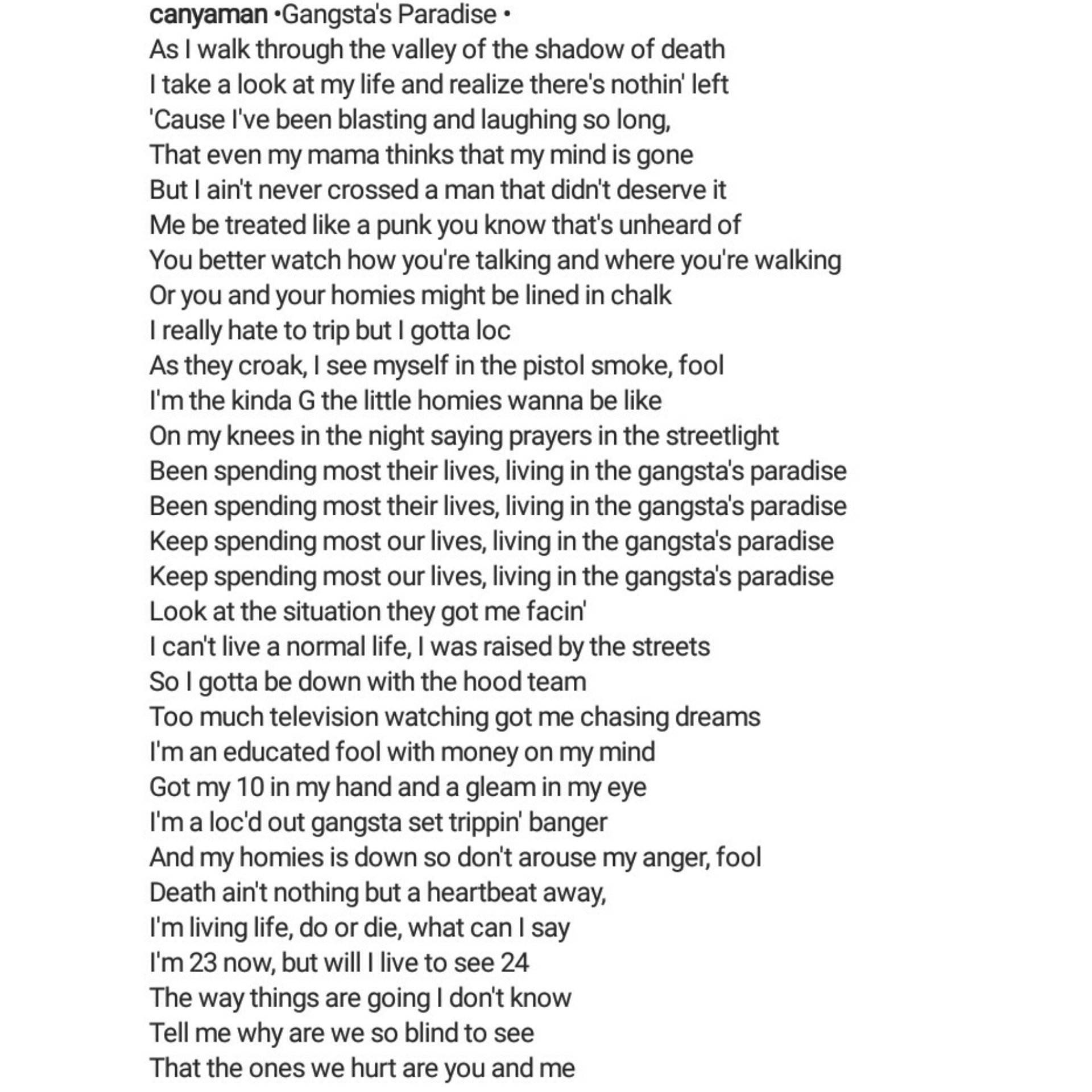 Докато се разхождам из долината на сянката на смъртта, хвърлям един поглед към живота си и осъзнавам, че нищо не е останало, защото толкова дълго взривявам и се смея, че дори майка ми смята, че умът ми е изчезнал, но аз никога не съм пресичал човек, който да не го заслужава. С мен да се държат като пънк, знаеш, че това е нечувано. и твоите приятели може да са облицовани с креда. Наистина мразя да се спъвам, но трябва да локализирам. Докато те крякат, виждам себе си в пистолетния пушек, глупак, аз съм доста. в уличното осветление Прекарва по-голямата част от живота си, живее в рая на гангста Прекарва по-голямата част от живота си, живее в рая на ганаста