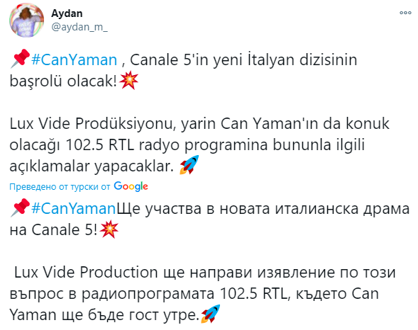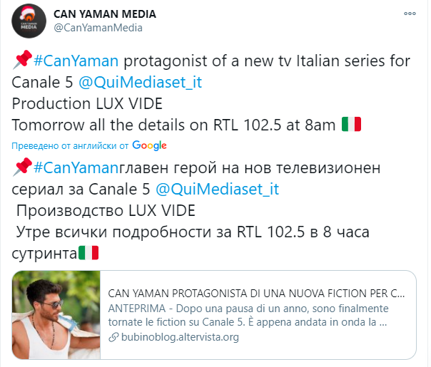 # CanYaman ще бъде гост по RADIO RTL 102.5🇮🇹 утре сутрин от 9 до 10.00 (италианско време) с представител на Lux Vide (италианска продуцентска компания) Лука Аргентеро (заснет с Ферзан Озпетек) и Елена София Ричи.