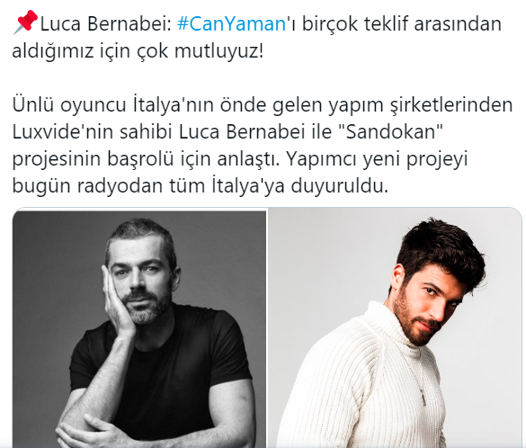 "Заснемането на драмата Сандокан ще започне през октомври 2021 година. Преди това известният актьор ще влезе в строг подготвителен лагер. По този начин характерът Сандокан, който беляза епохата на италианския народ, ще оживее с Can Yaman".