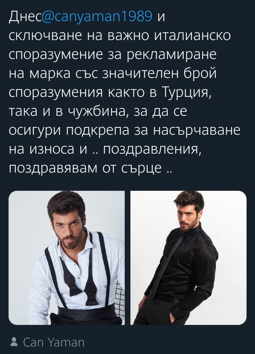 Актьорът #ДжанЯман направи две сделки наведнъж в Италия. Яман, който ще участва в реклама за тестени изделия, също обяви, че ще играе водеща роля в проекта ''Сандокан'', отново в Италия.