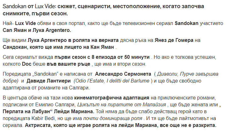 Много хубава новина е това, че сериалът за Сандокан ще е на английски. Това е голяма преднина, още преди да са започнали да снимат. Браво, добре са го намислили! Hands Clap