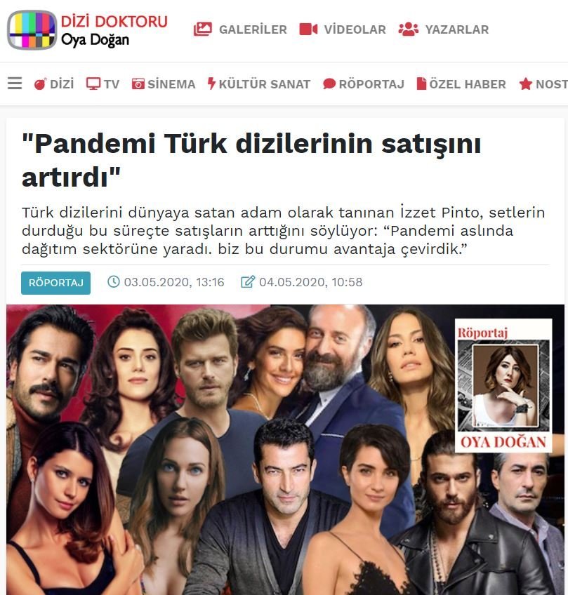 Генеральный директор агенства Global Agency Иззет Пинто, известный как человек, который продает турецкие сериалы всему миру, говорит, что когда съемки сериалов прекратились, продажи выросли: "Пандемия фактически помогла распределительному сектору. Мы превратили это в преимущество.