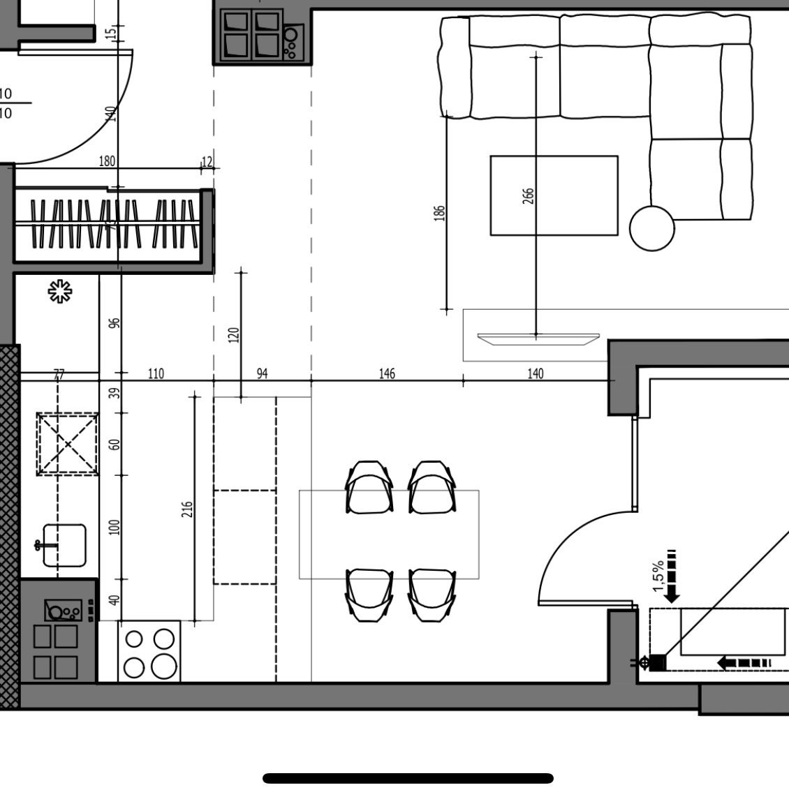 Факт,ще се загуби простора на голямата стая (почти 40 кв.).  Мислих си,обаче,че ще имам по-малко проблем с митизмата на готвено така.