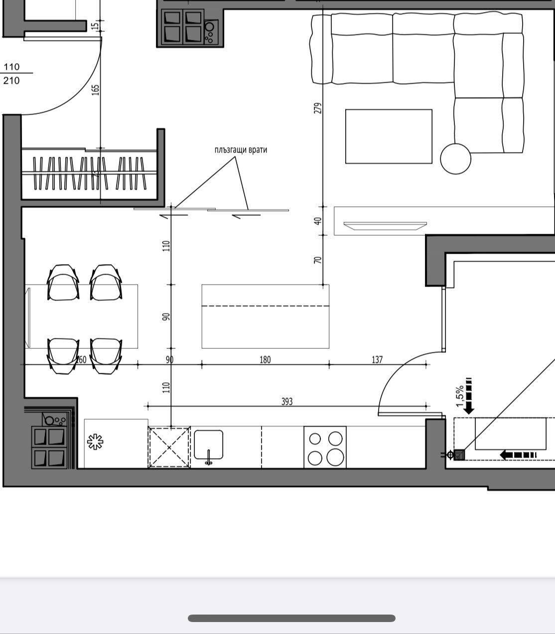 Не можах да разбера също така какъв е смисълът на плъзгащите се врати, при положение, че останалата част към хола е отворена. Ще трябва да местиш и ВиК-то през шахтата на отдушника на другата стена. Трябва и майстор да се изкаже. Сигурно не е невъзможно, но все пак...