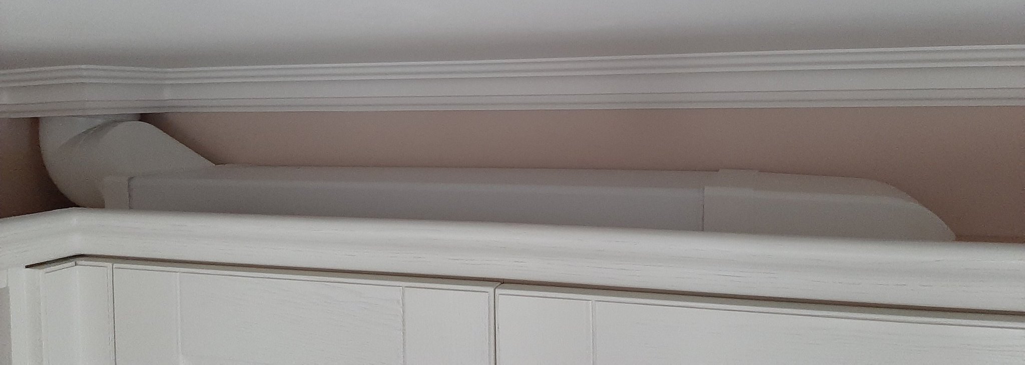 Има вариант и той е с плоски отвеждащи парата PVC тръби разположени в най-горната част на шкафовете в близост до тавана. Големите метални кръгли заемат много място и губиш много от шкафа, но ако се ползват ПВЦ плоски заемат по-малко място и ако се прави ремонта от нулата според мен има как да се разположи така че да са максимално изтеглени към тавана и вкарани зад примерно една обслужваща лайсна над шкафовете. Нещо подобно видях тук от един потребител по-назад в темата: