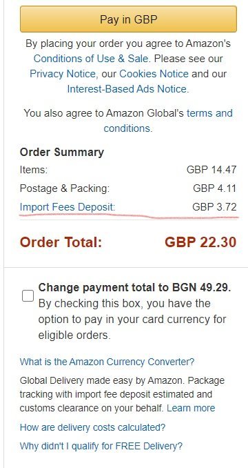 Момичета, при пазаруване в американския амазон при приключване на поръчката се заплащат и всички дължими митнически такси. Снощи си правих експеримент с английския амазон. На последна стъпка се е появило Import Fees Deposit. Това дали значи, че ще си платя таксите предварително и няма да се наложи разходки до митницата, ако сумата го налага?