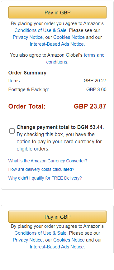 Моята беше около 24 паунда с доставката. Не би трябвало да се дължат митнически такси, тъй като Амазон автоматично ги начисляват, когато се мине предполагаемия праг (явно е около 25 паунда). Но не бързам да давам категорични мнения преди да видя пратката си снимана от превозвача в Германия! Чоколина носи добри вести, така че се надявам да не е изключение!