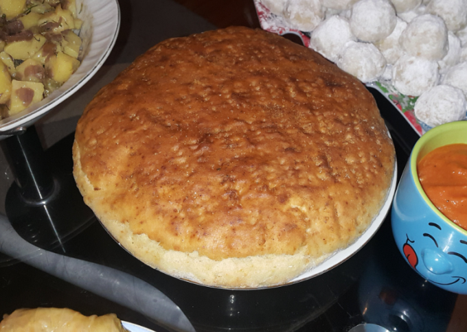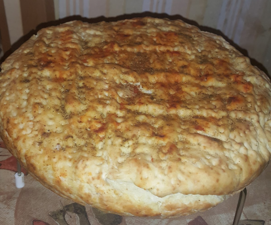 Брашното се пресява със солта, захарта и маята.Прави се кладенче и вътре се изсипват олиото и водата.Замесва се меко тесто и се оставя за удвои обема си.След това се поставя в леко намаслена с олио тава и горната кора се надупчва хубаво с вилица за да не се отдели при печенето.Пече при температура около 200гр.