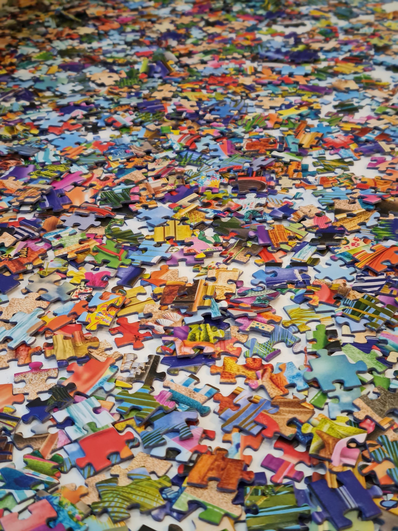Част е от Коледния подарък - 2000 части, всичко е ужасно шарено. На малката подарихме 1000 части - джунгла, всичко е зелено. Станах разногледа, защото помагах ту на едната, ту на другата.