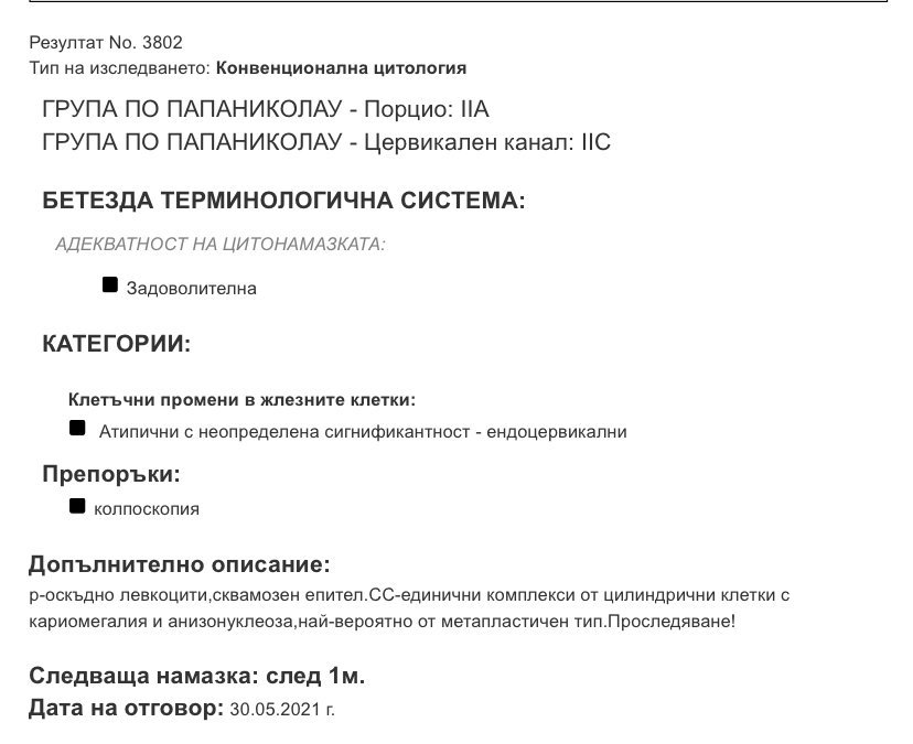 Здравейте, някой може ли да даде мнение за моя резултат. Правиха ми колпоскопия при прегледа, когато пуснахме и цитонамазката, всичко беше наред, а сега ме насочват пак за колпоскоп