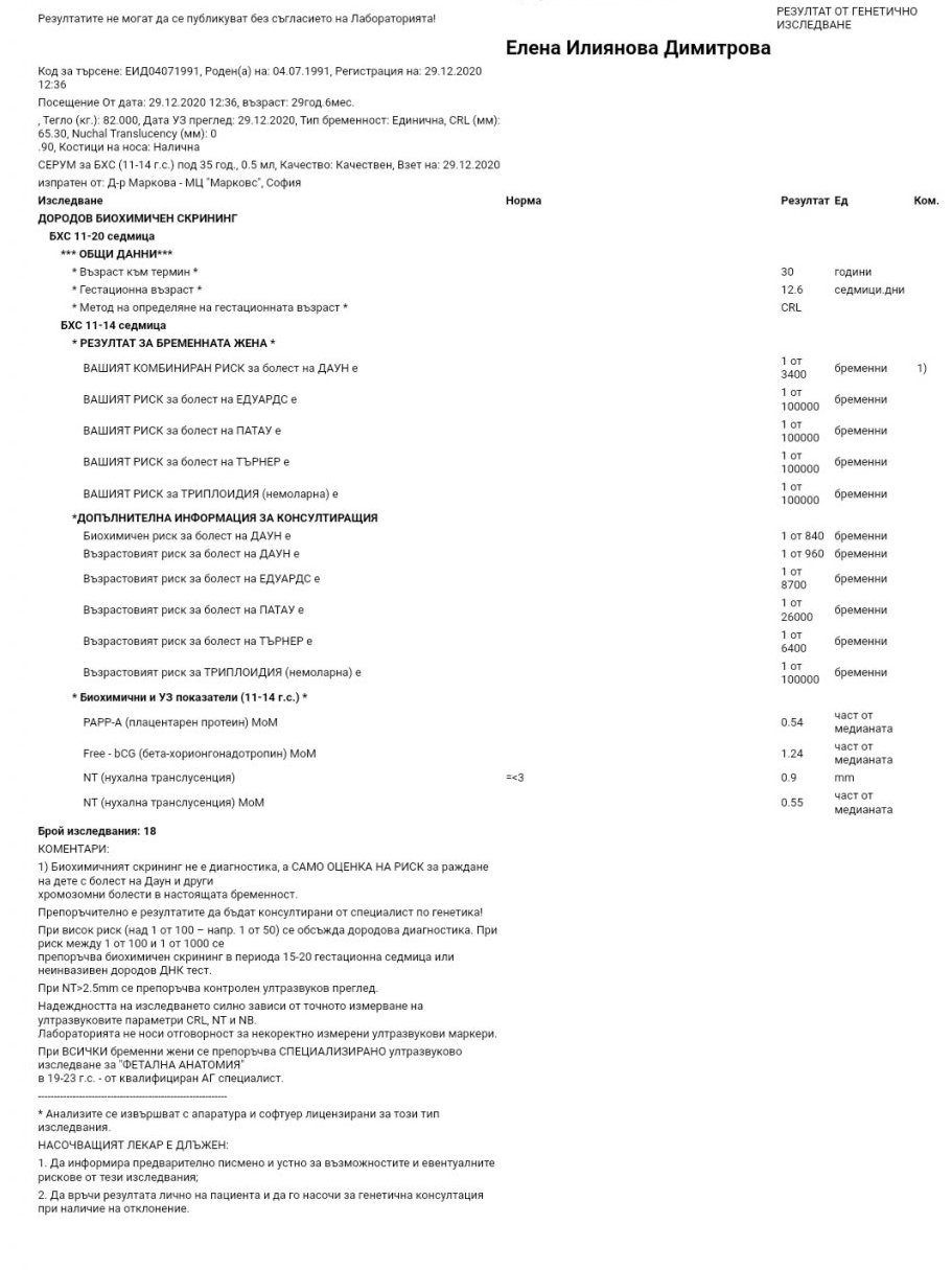 Аз също ходих при лекаря при който е ходила Усмивка07, 30 мин преглед и много подробни обеснения, кое мери колко е стойността, какви са референтните граници за седмицата която съм и при какви стоийности се говори за генетичен проблем.