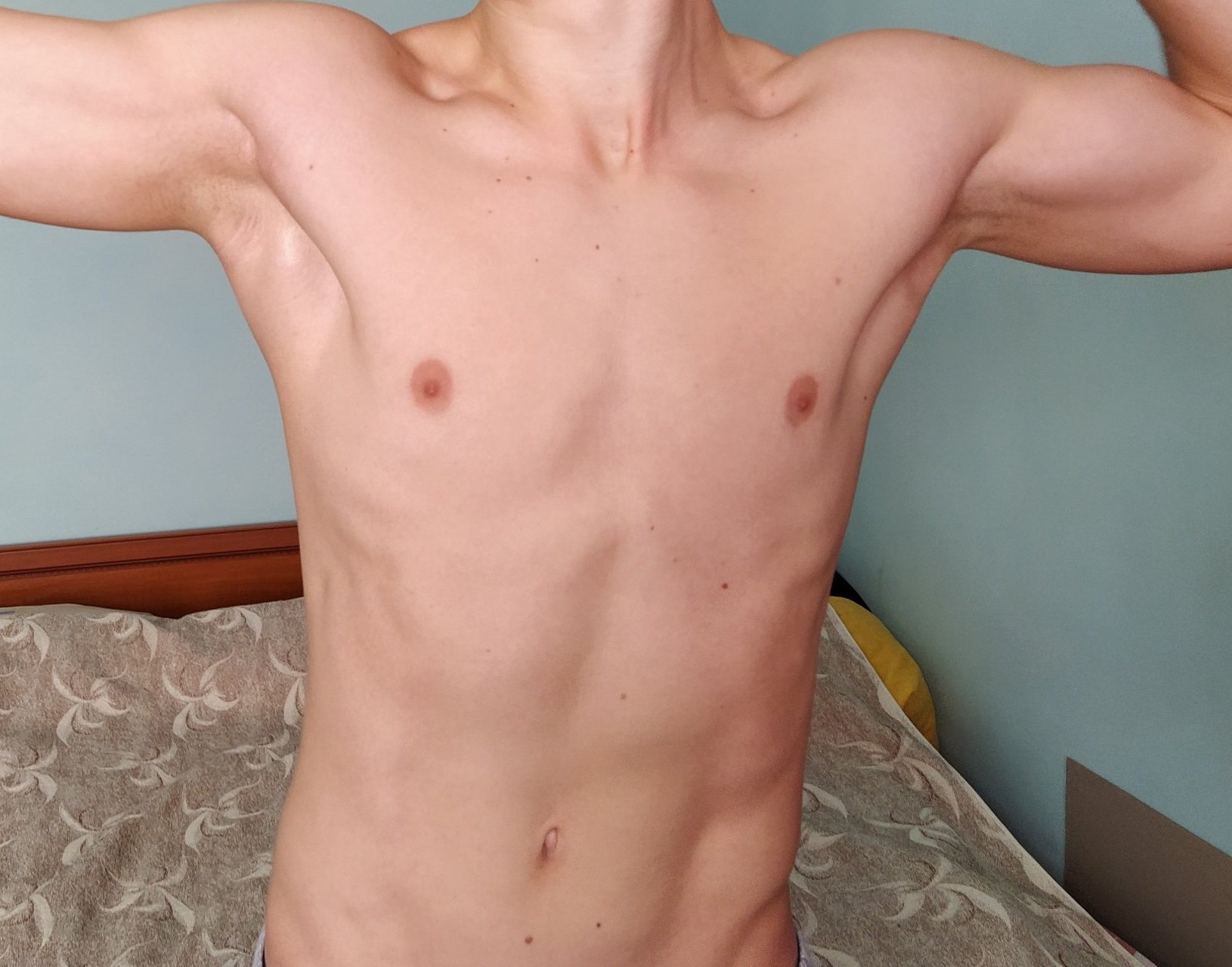 Защото както е тръгнал има малък шанс да стане анорексик защото плочки се виждат при 14~10 процента  подкожни мазнини.