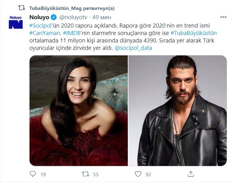 🆕Объявлен отчет Socipol за 2020 год. Согласно отчету, самое модное имя 2020 года - #CanYaman. Согласно результатам Starmeter # IMDB, # TubaBüyüküstün занял 4390-е место в мире среди 11 миллионов человек в среднем и занял первое место среди турецких игроков.