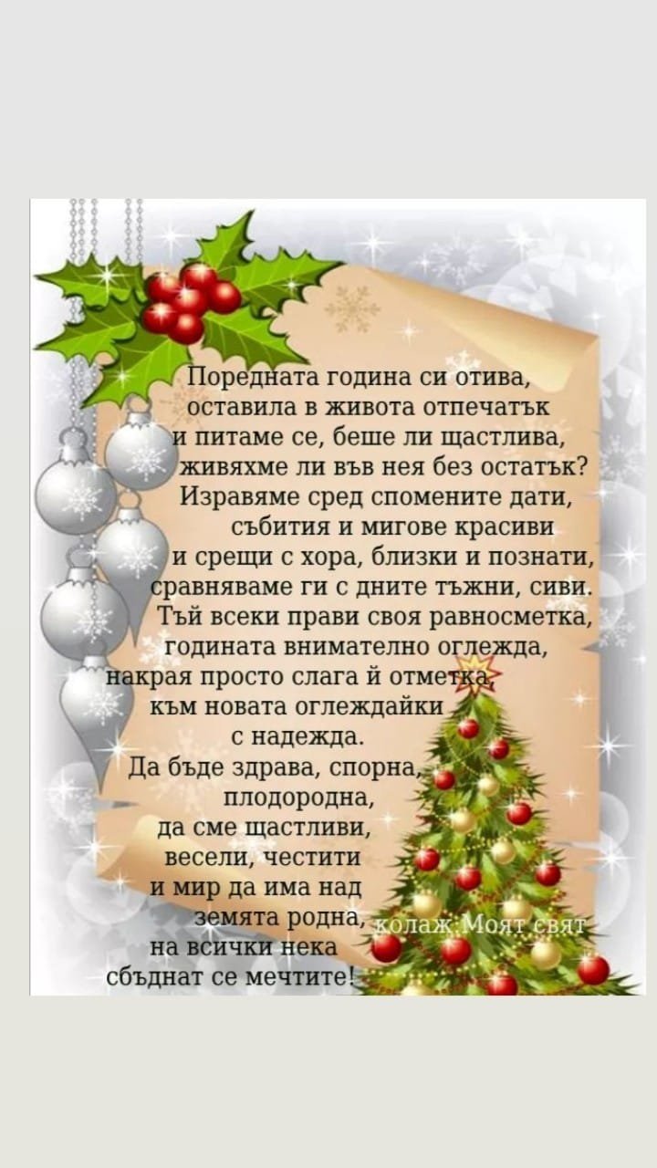 Нека Новата 2021 година,която влиза в дома ни,да го направи с кошница пълна : със здраве,с надежда, радост и любов. Да ни избави от тревогите, болестите, грижите и дори от най-малките неприятности. Да ни донесе радостни грижи и работа за душата! Да се смеят децата ни и слънцето да огрява винаги лицата ни. И да ни дари с голямо щастие и здраве. С цялата си душа желая светла и хубава година!