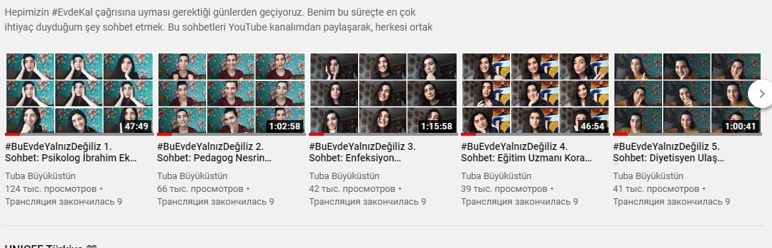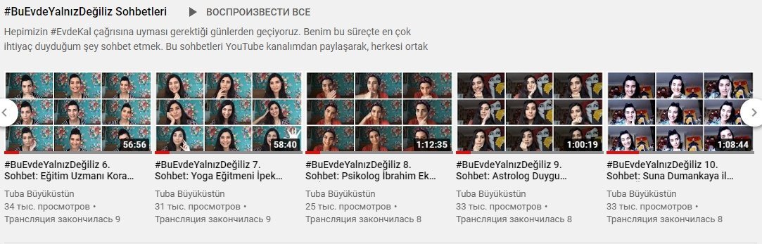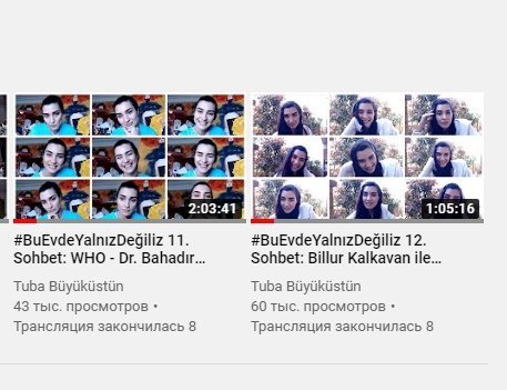 YouTube. Вместе с Тубой, мы встретились с психологом, педагогом и консультантом по психологии, специалистом по инфекционным болезням и клинической микробиологии, экспертом по дистанционному обучению, диетологом, инструктором по йоге, с астрологом, экспертом по красоте, докторами. Красной нитью всех эфиров стала тема пандемии коронавирусной инфекции. Говорили о влиянии коронавирусной среды на нашу психологию, о дистанционном обучении на дому, говорили о том, как следует питаться в наши дни, когда наша активность дома ограничена, а наш иммунитет должен быть высоким, о том, что мы можем сделать, чтобы защитить свое тело и психическое здоровье, о влиянии коронавируса на отношения между людьми, о женской красоте и женском здоровье и просто болтали.