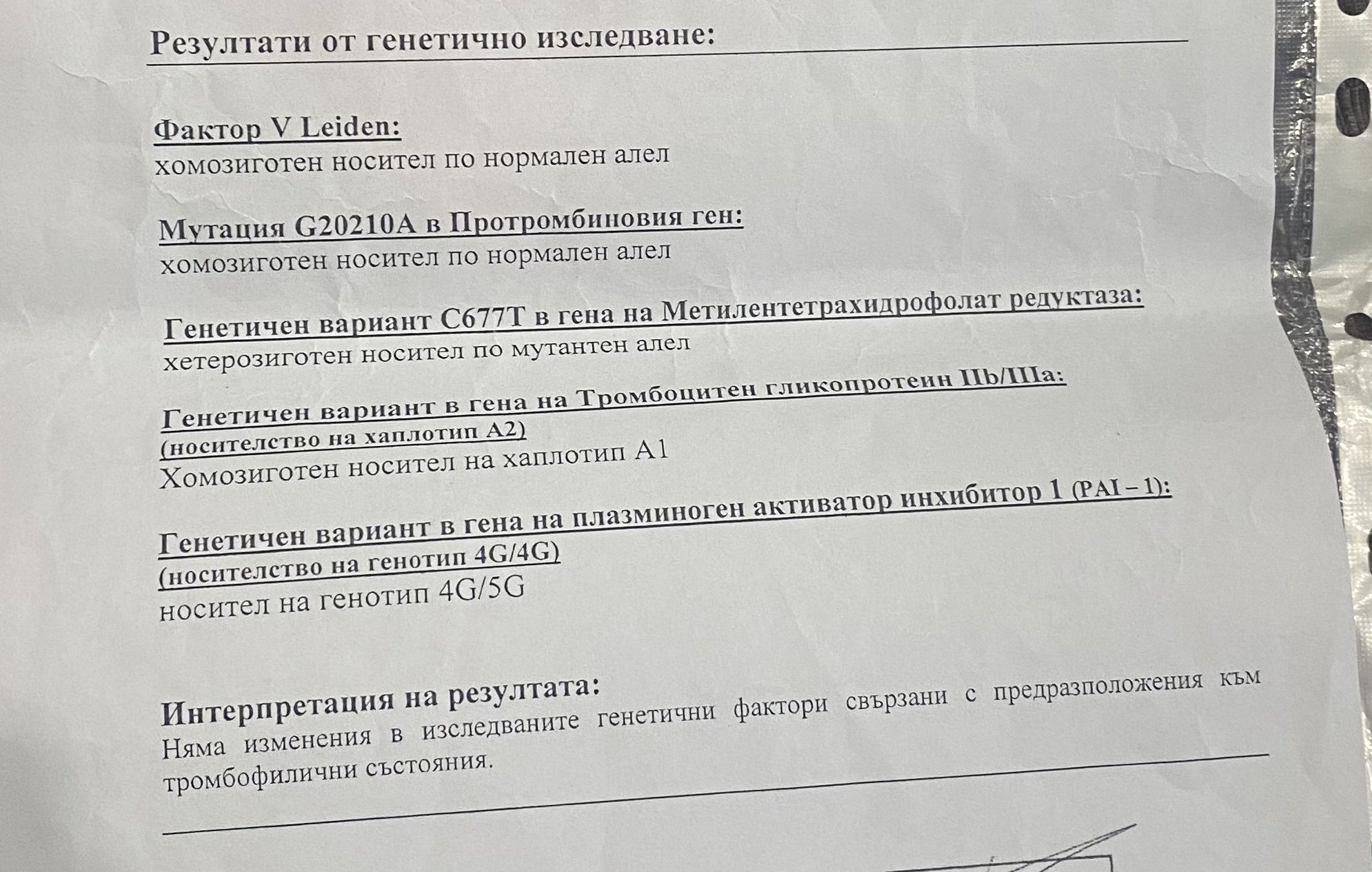 Tedsee имаш мутации - 1 хомозигот и високорискова и 2 умерено рискови хетерозиготни. Не знам защо накрая е написана тази щуротия, че няма изменения. Слушай си лекарите и се обади в лабораторията да ти напишат прилично заключение, за да не се окаже проблем да си купуваш клексан заради този документ