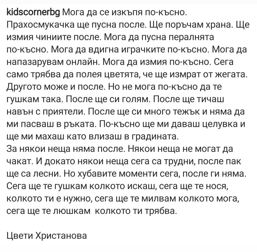А тозинтекст го видях в нета и го качвам за всички мами, които си мислят, че не могат да насмогнат на задълженията. Ами не можем! И това е ок, защото имаме най-прекрасната привилегия в момента- да се грижим и обичаме тези малки същества ❤️