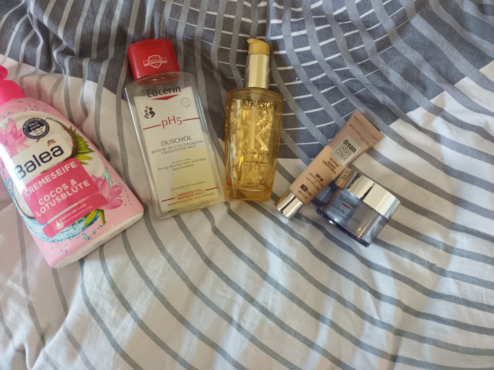 Душ олио на Юсерин-мирише гадно, но е доста добро. Имам запаси от него, беше на промоция та ще продължавам да ползвам. Почиства и грим, но не идеално като само за 1 стъпка. Не замества лосион за тяло.