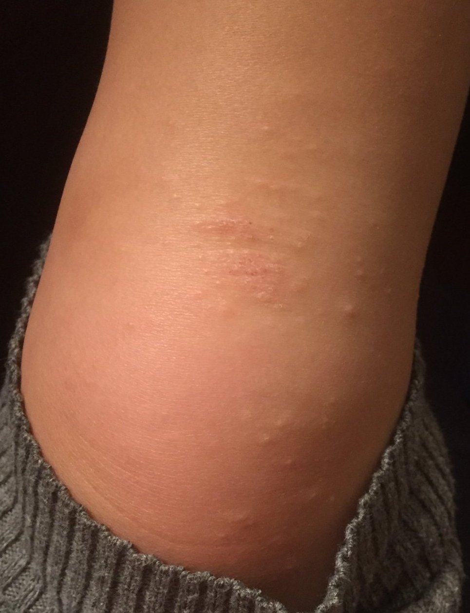 Днес забелязах този обрив на коляното на бебето, грапав и твърд е. Сутринта след събуждане беше червен.