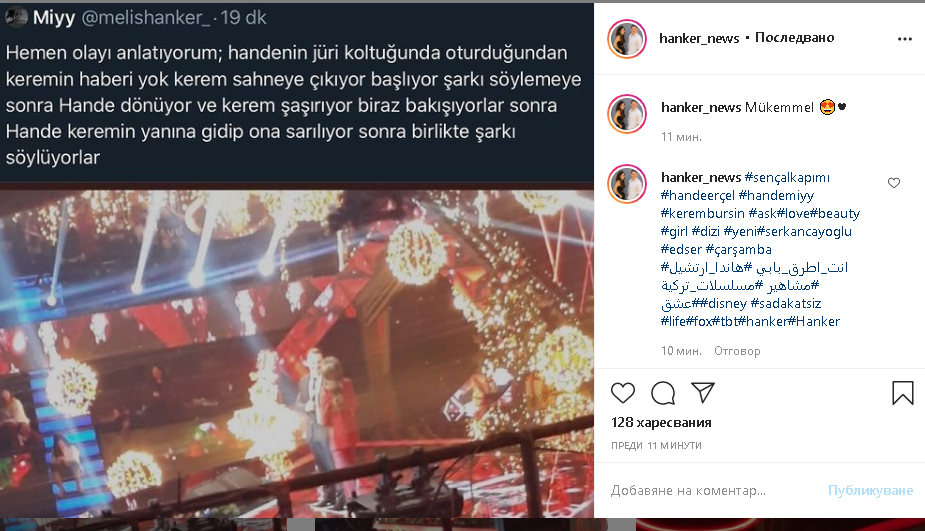 Има туит, че Ханде е седнала на стола на Мурат Боз без Керем да знае. Когато се е обърнала и той я е видял, толкова се е изненадал, че си е забравил текста. Милият! 😅 Дали ще пеят или не заедно, не знам. Може поотделно, може заедно. Ще разберем, като гледаме шоуто накрая. Нямам търпение. ❤