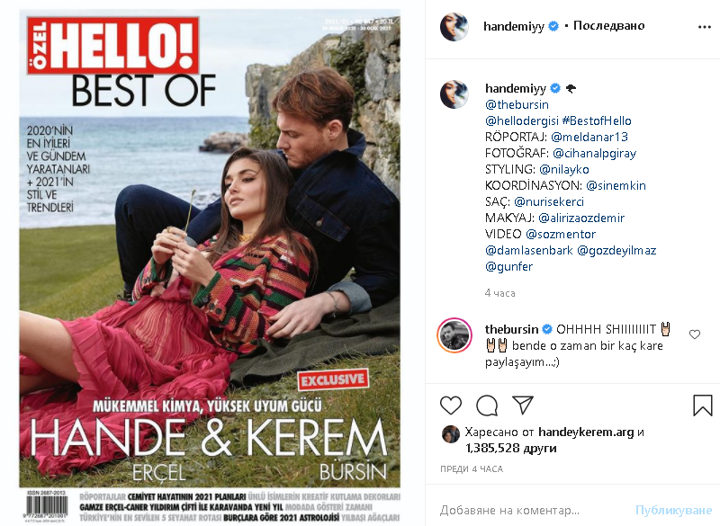 Ханде си сподели корицата, че е най-сейфти вариант. А Керем избра най-скучната снимка. Хм?! 🤔 Отгоре на всичко Ханде дори не лайкна снимката, а само я коментира... Не знам какво да си мисля. От една страна отричат и се държат “приятелски”. Но, ако са толкова близки и само приятели, няма да им пука и ще са много по-отворени в качването на снимки, коментари и тем подобни. Както беше в началото. Както са другите от каста. А при Керем и Ханде има едно пазене, което се усеща. “Гузен, негонен бяга” е положението май, май... 😉 Както и да е, понеже те не споделят любимата ми снимка от фотосесията, аз ще го направя, а съвсем скоро няма да издържа и ще се преоблека. ❤