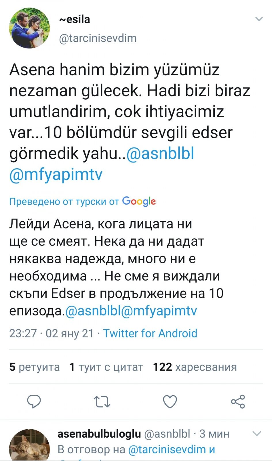 Искам и аз да сънувам и този епизод, да не се беше състоял от средата. Надявам се да си вземат бележка новите сценаристи и тази история с принца и лудостта му бързо да приключи. А този актьор беше писал, да не го мразим много и че щял да се реваншира. Нещо такова ми се върти в главата. Сериалът ще го гледам докрай, без Еда и Серкан не мога.