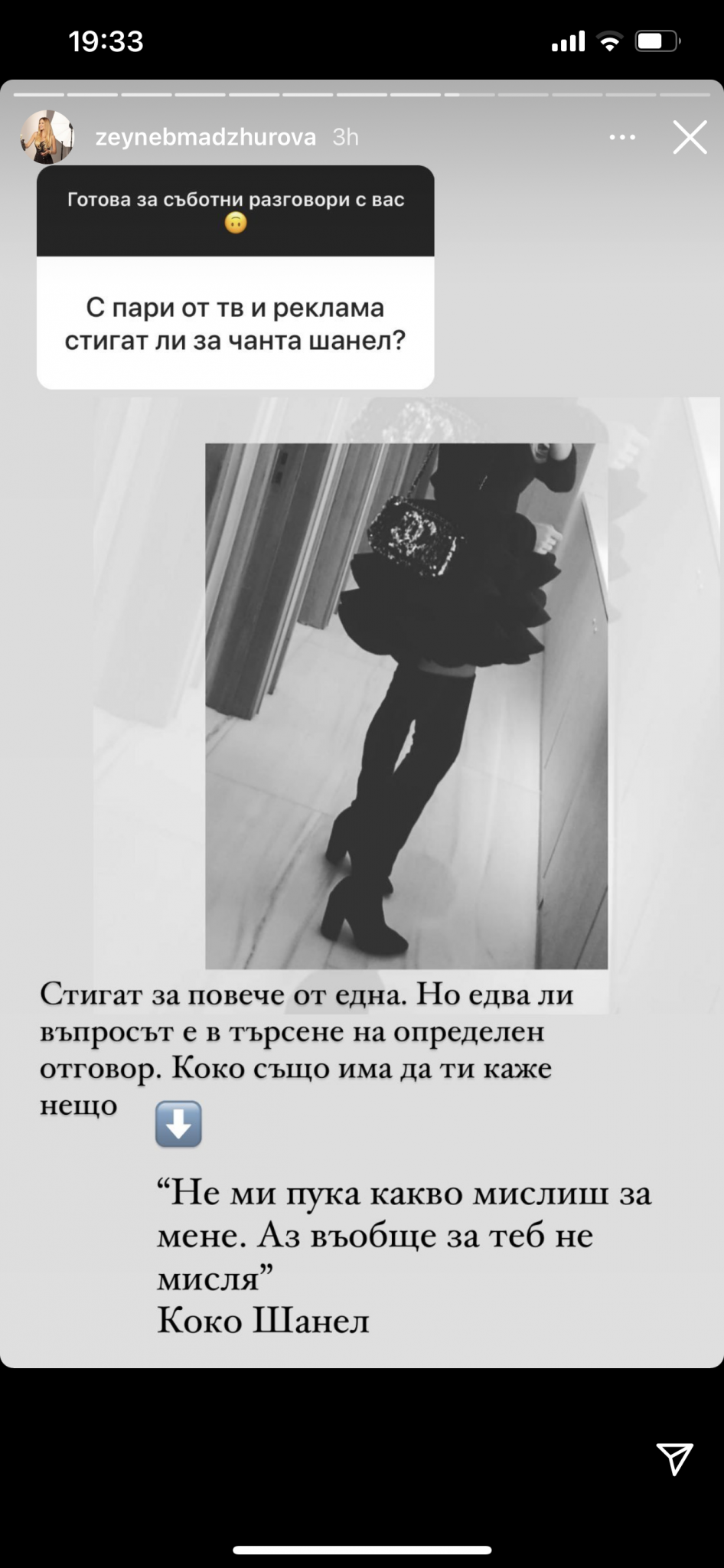 Големи са напъните на такива като Зейнеб да демонстрират непукизъм. Наистина не разбирам защо възвишено не се радва там на Шанелите си, ами тръгнала да доказва колко не й пука. "Коко" имала какво да каже...сякаш с Коко двечките са си пиели чая в Биг Брадър, между обарванията и закачките със Здравко.