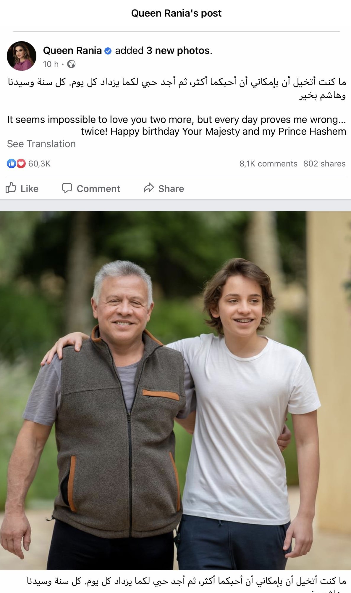 Кралица Рания честити рождения ден на краля на Йордания и неин съпруг Абдула 2 и на сина си, принц Хашим.