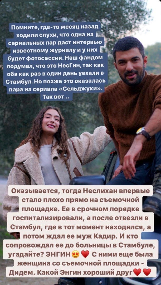 * Оказва се, че тогава Неслихан се разболява за първи път точно на снимачната площадка. Тя била спешно хоспитализирана и след това откарана в Истанбул, където в този момент бил и чакал съпругът й Кадир. И кой я придружи до болницата в Истанбул, познайте? ЕНГИН. С тях имаше и жена от снимачната площадка - Дидем. Енгин е добър приятел.