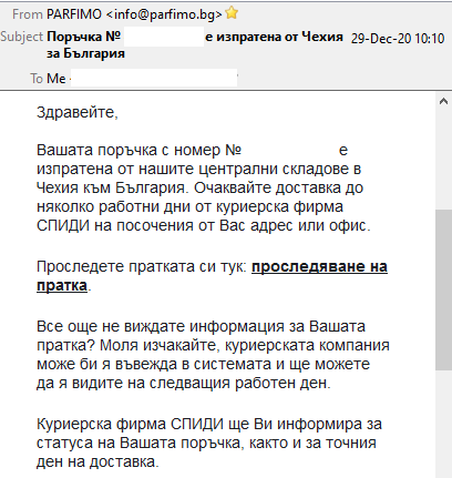 Снощи пуснах поръчка от Парфимо, днес имам мейл, че е изпратена.