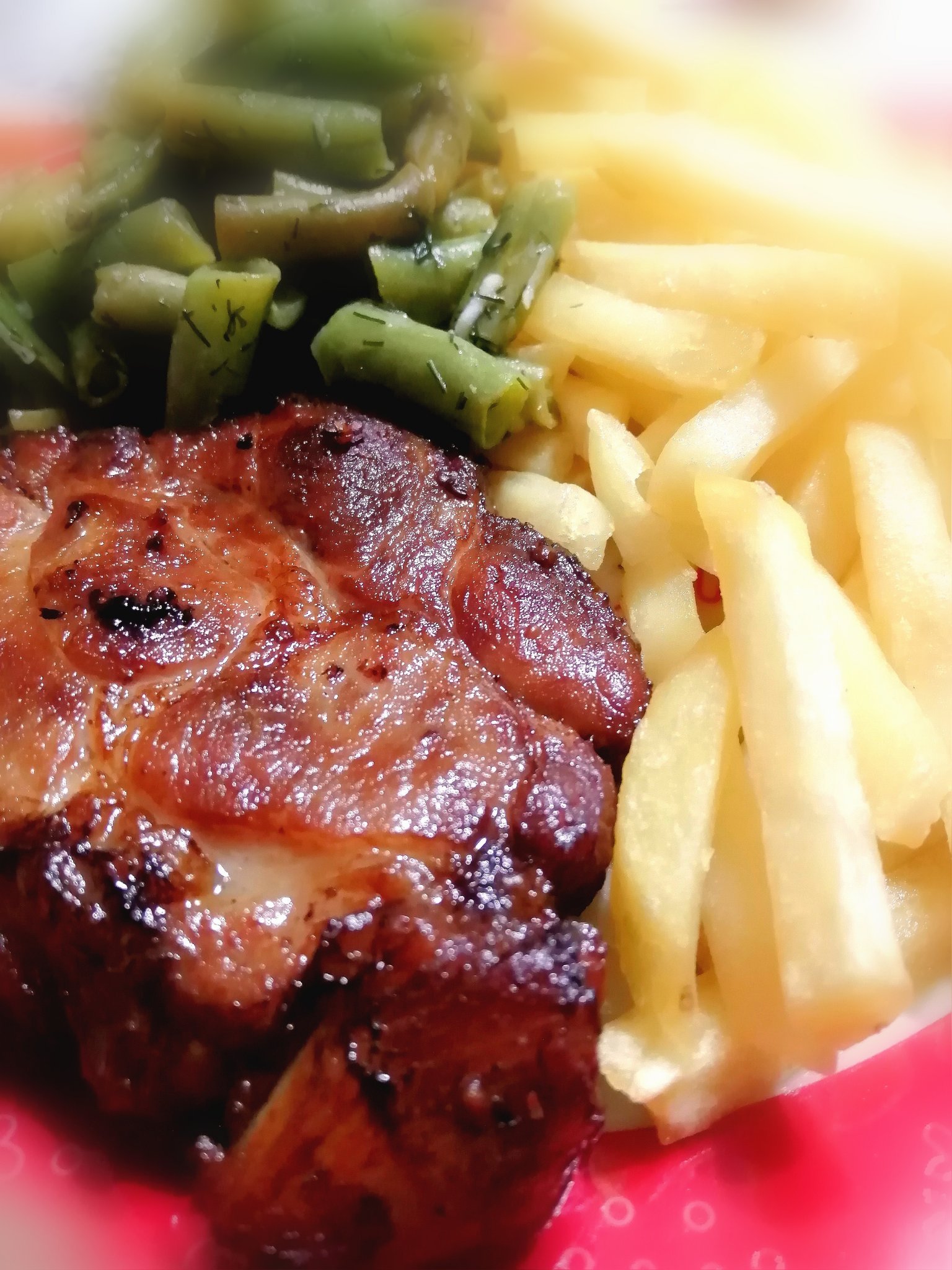 Днес домашно маринован свински врат без кост на фурна с гарнитура от зелен фасул с копър, чесън, сол, лимон и олио и пържени картофки конфекция: