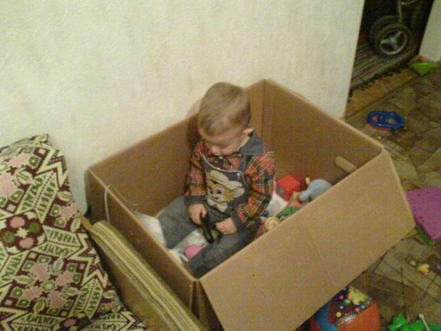 Точно в момента беше влезнал в кашона с играчките (използваме кашон от телевизор) и ги хвърляше навън. Ето така:
