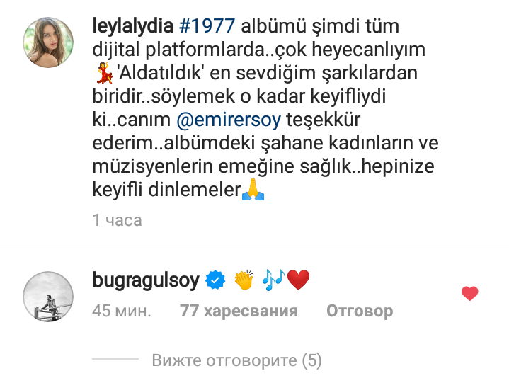 Лейля Лидия: Албумът на 1977 излиза вече на всички дигитални платформи. Толкова съм развълнувана People Dancer "Бяхме измамени" е една от любимите ми песни ... беше такова удоволствие да пея. Tada Благодаря ти скъпи Емир Ерсой ... благодаря на невероятните жени и музиканти в албума, златни ви ръце. Blush Приятно слушане на всички Hands Pray