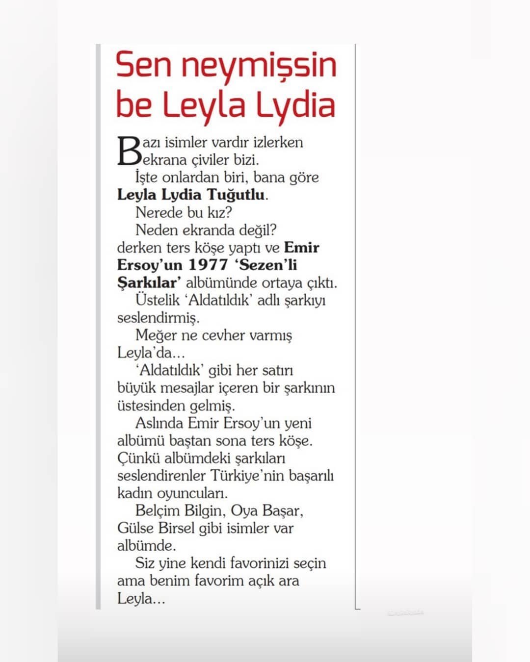 Видях в ИГ един плакат от списание Hurriyet Kelebek , в който явно рекламират песните на Лейля Лидия. Ако някой може да го преведе ще е интересно.