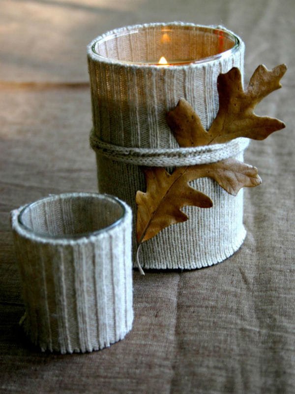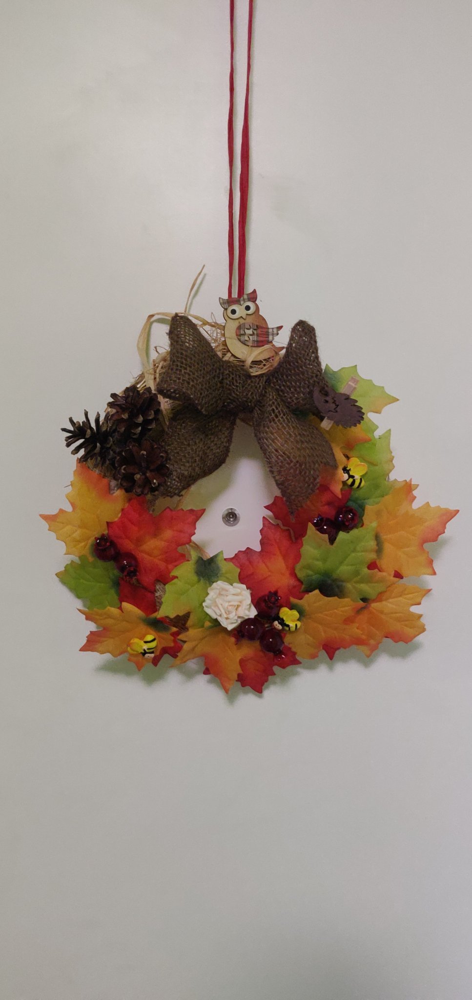 Понеже нали все набързо правя по нещо, за ессенно оформление сложих нещо направо светкавично този път. Есента ми е един такъв междинен сезон и нямам много украси, служа си обикновено с кратунки от поляните около нас, кафяви покривки и свещи и един комплект шарени листа, които видяхте на венеца.