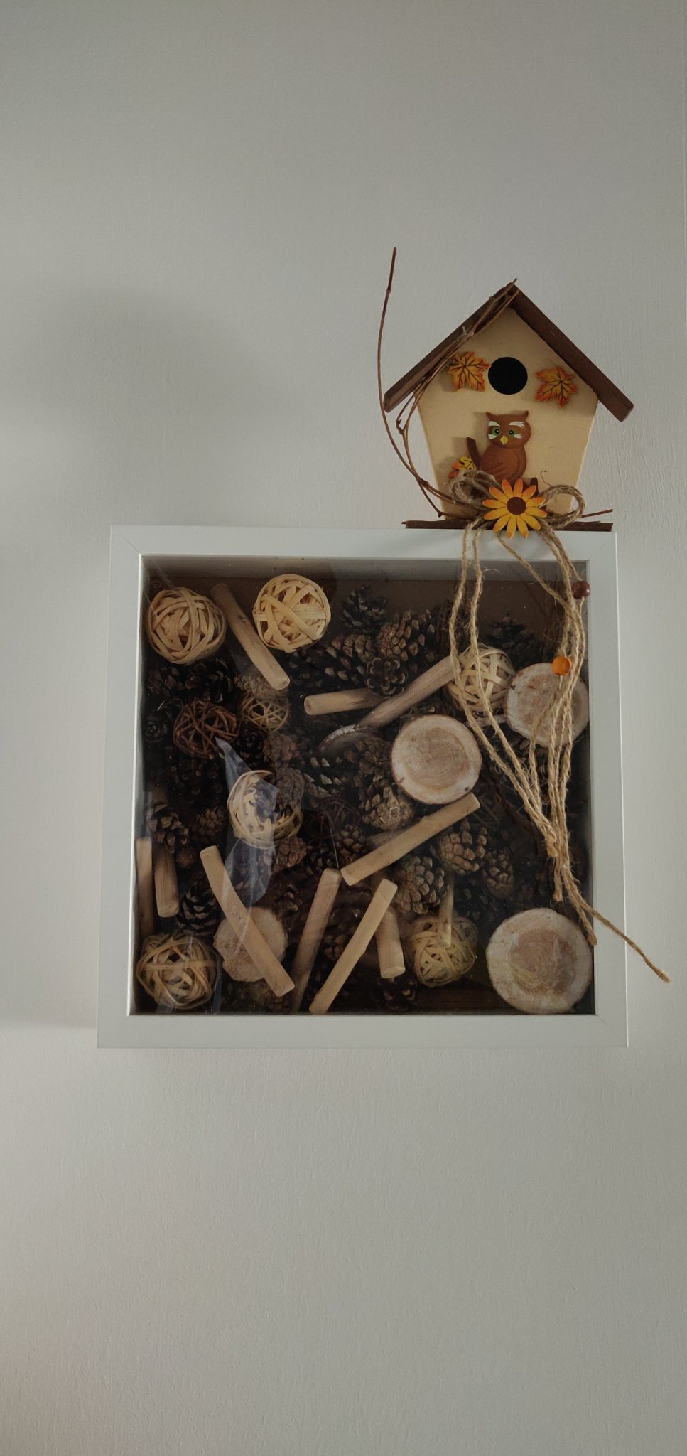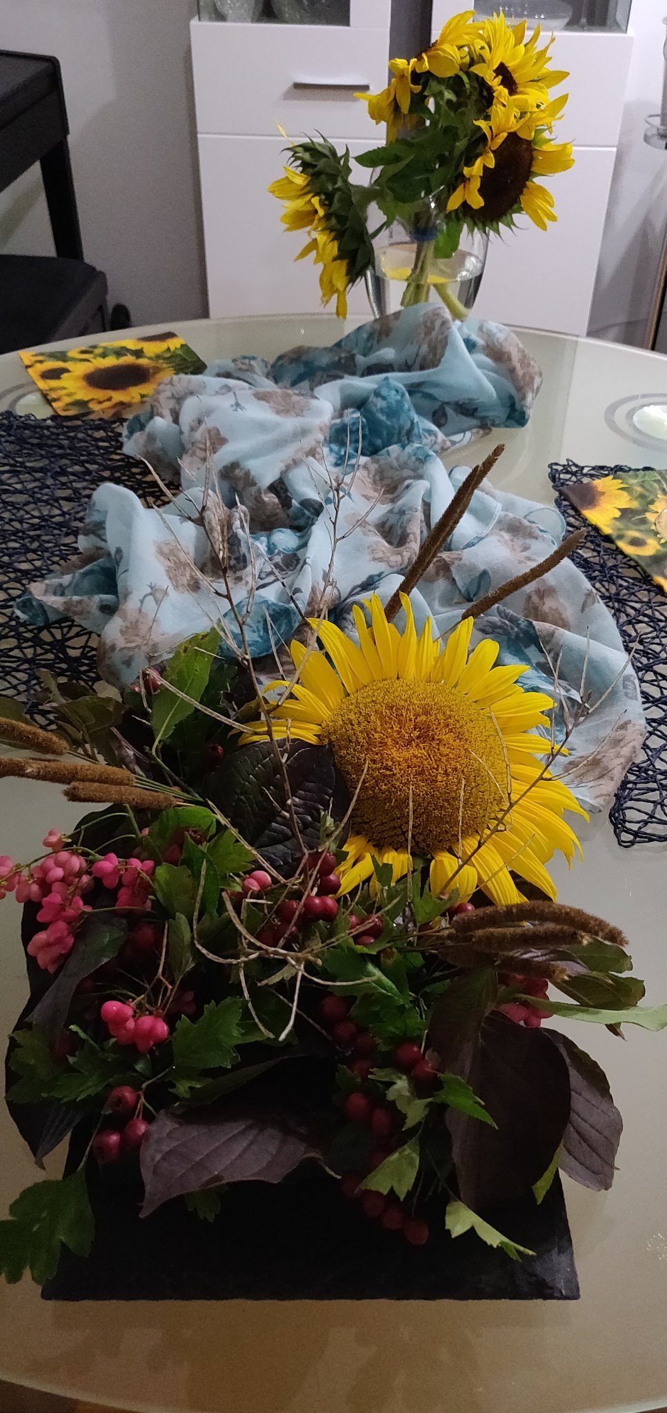 Вчера се разходих покрай близката гора и събрах каквито листа, трънки, плодчета и цветове намерих. Аранжирах в/у цветарска гъба и в момента използвам за център на холската маса. 😃