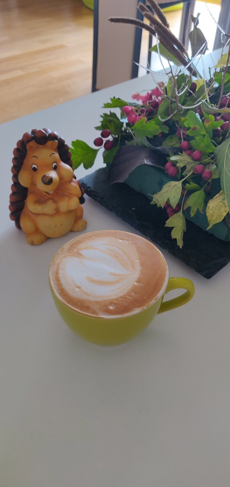 А след като мъжът сутринта точи! баница за закуска, после ми направи и лате арт, пасна ми чудесно с есенния център и таралежа 😃: